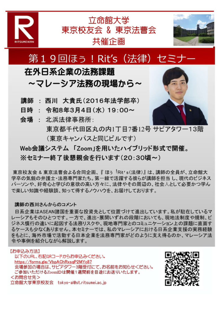次回は、西川 大貴先生(2016年法学部卒)を講師に迎え、「在外日系企業の法務課題 ~マレーシア法務の現場から~」と題して、以下のとおり開催します!